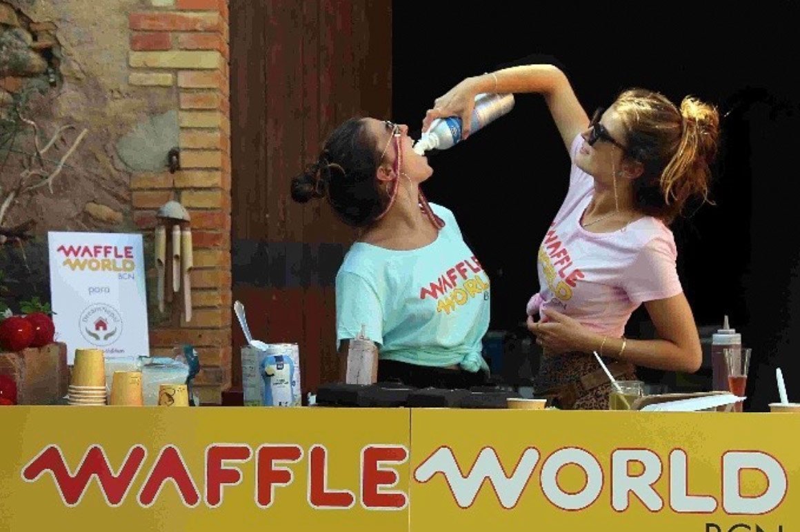 chicas waffle world tomando nata en spray